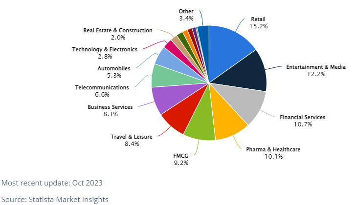 小売業界は、アメリカにおける広告支出のうち15.2%を占め、もっとも大きな割合を誇っています。また、エンターテインメント・メディア、金融、医療・健康、日用消費財業界も、広告支出において大きなシェアを占めています。