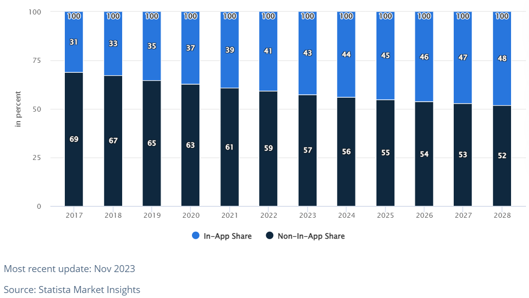近年の注目すべきトレンドの1つは、モバイル広告とアプリ内広告のシェアの増加です。