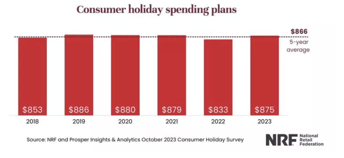 全米小売業協会(National Retail Federation)の予測によると、2023年の個人消費は2022年に比べて約42ドル増加すると予想されており、前年度の833ドルに対し、2023年には一人当たり平均875ドルの支出になると推定されています。