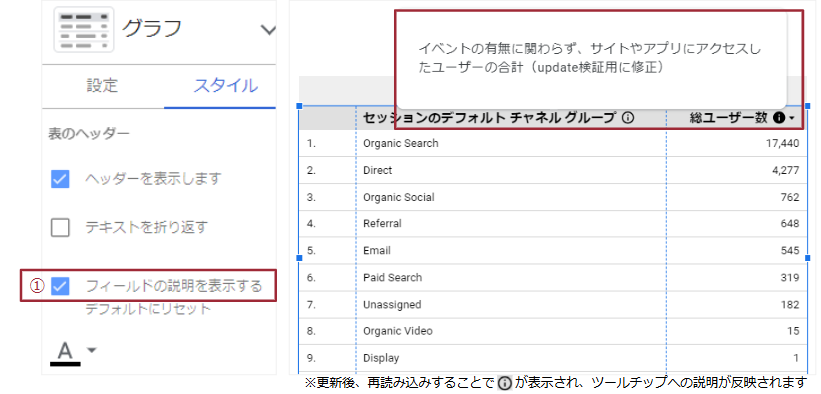 表グラフのヘッダーに対し、下記画像内①の「フィールドの説明を表示する」をチェックすることで、マウスオーバーした際に表示されるツールチップに説明を追加可能になりました。