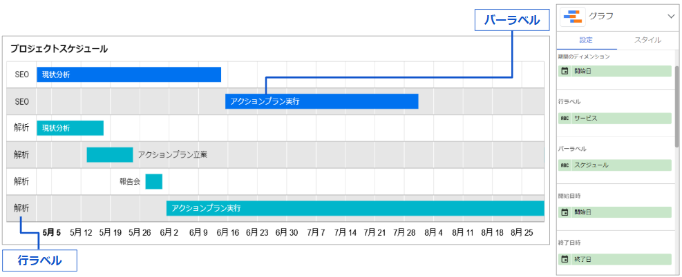 ガントチャートを表現可能なグラフ、「タイムラインチャート」が新たに追加されました。