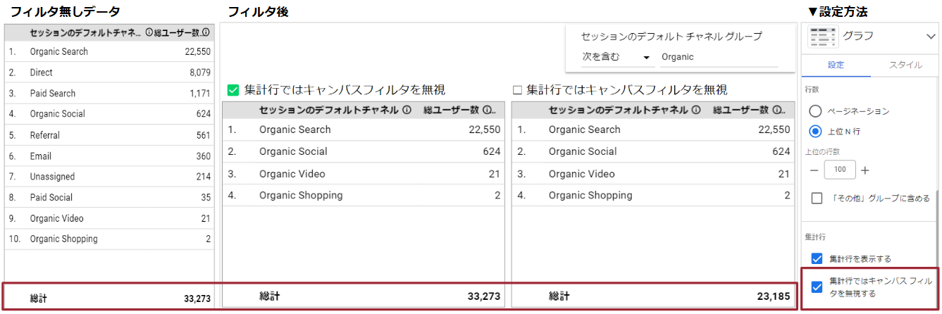 グラフの集計行において、キャンバス内で適用したフィルターを無視した合計値を表示可能になりました。