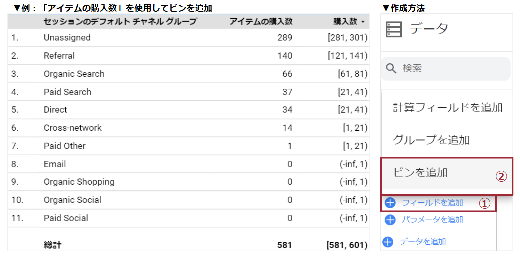 フィールドタイプ、「ビンを追加」使用により、CASE WHENフィールドで計算式を作成したり、SQL文を作成したりすることなく、ディメンションの値を指定の階層に分けてカテゴリ化可能になりました。