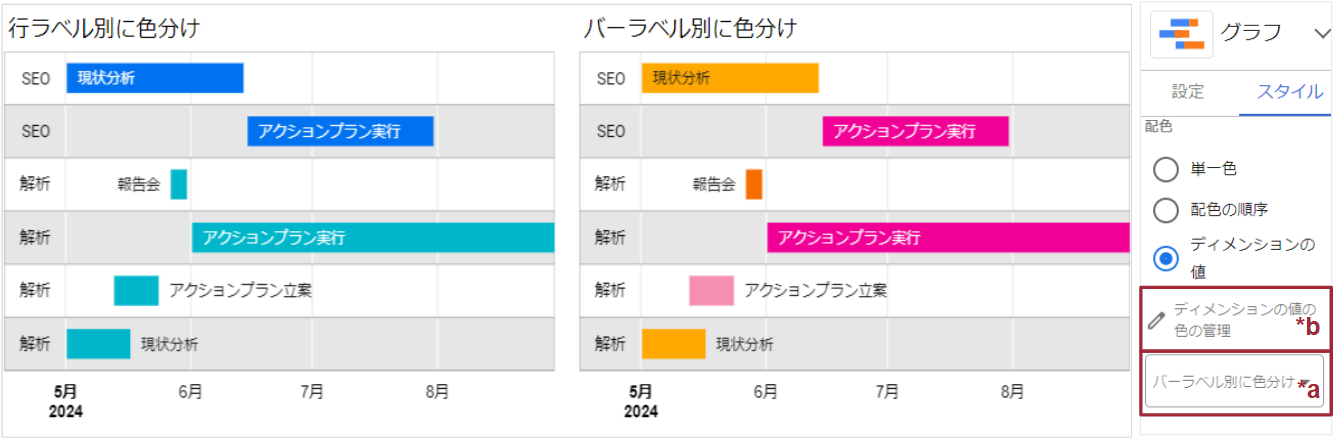 タイムラインチャートの色分けオプション追加により、ディメンションの値によって色分け可能になりました。「バーラベル別に色分けa」選択後、色の管理bよりディメンションごとに色を選択可能です。