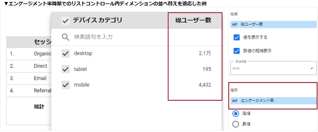 ポイント:並べ替えの設定を見たい指標の降順にすることで、ランキング1位の該当ディメンションを表示するなど、スコアカードを活用したデータ可視化方法の幅が広がりました。