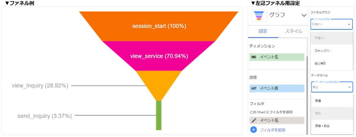 ポイント:ファネル幅の変更が可能になり、より視覚的に数値をグラフで表現可能になりました。