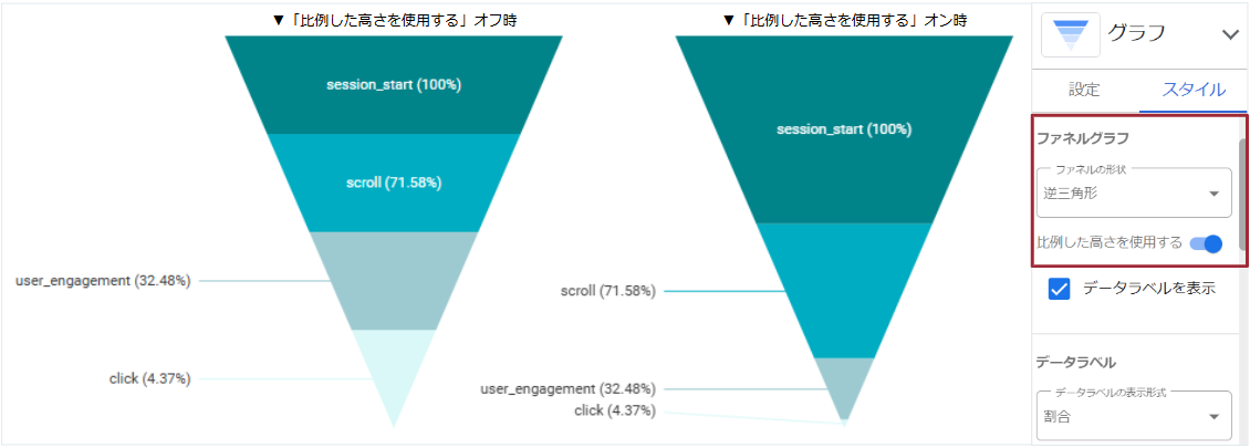 逆三角形のファネル選択時、「比例した高さを使用する」をオンにすることで数値に比例したファネル幅に変更できるようになりました。
