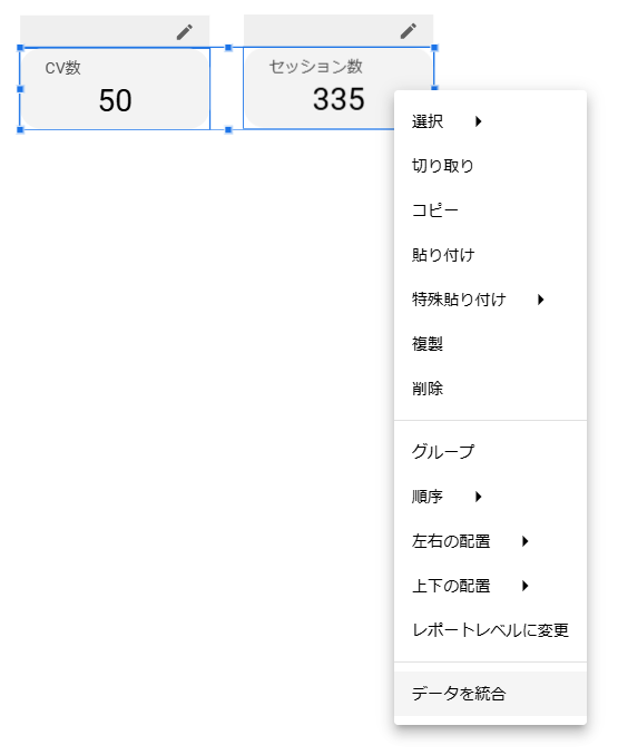 例えばCVRを計算したい時、スコアカードでCV数とセッション数を表示し、2つを選択した状態で右クリックをすると [データを統合] というメニューが表示されます。