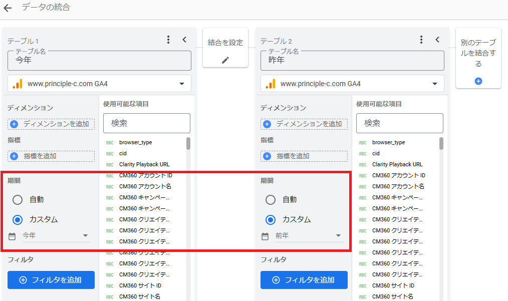データ統合の設定画面では、各テーブルに期間やディメンション、指標に対してフィルタリング設定が追加できるため、「テーブル1は今年のデータ、テーブル2は昨年のデータ」とすることでレポートの自由度が高くなります。