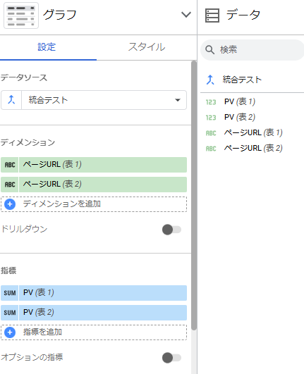 データ統合を行った時点では、以下のようにディメンションと指標がデータソース毎に存在します。