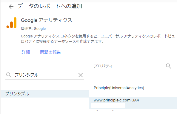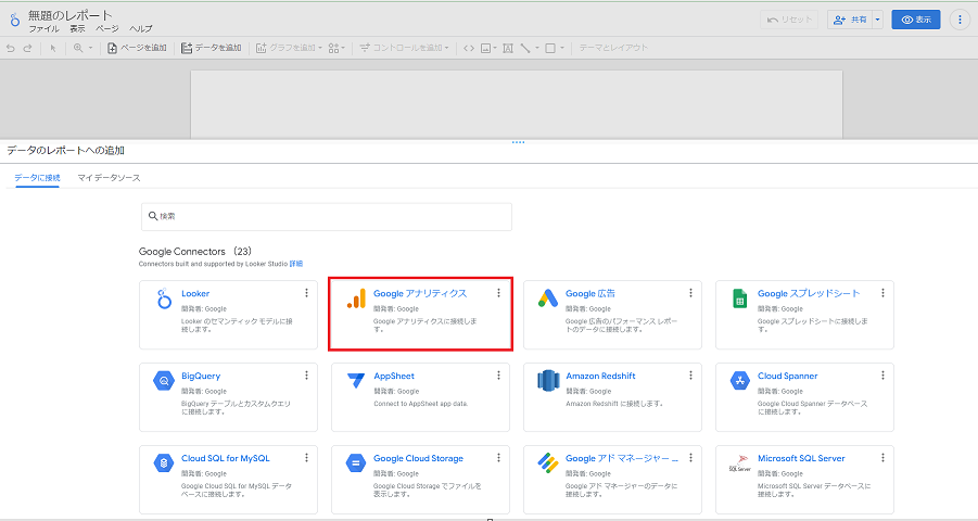 (1) まず、Looker Studioで新しいレポートを追加し、コネクタからGoogle Analyticsを選択します。これにより、利用中のGoogleアカウントにアクセスし、権限を持っているプロパティが表示されます。