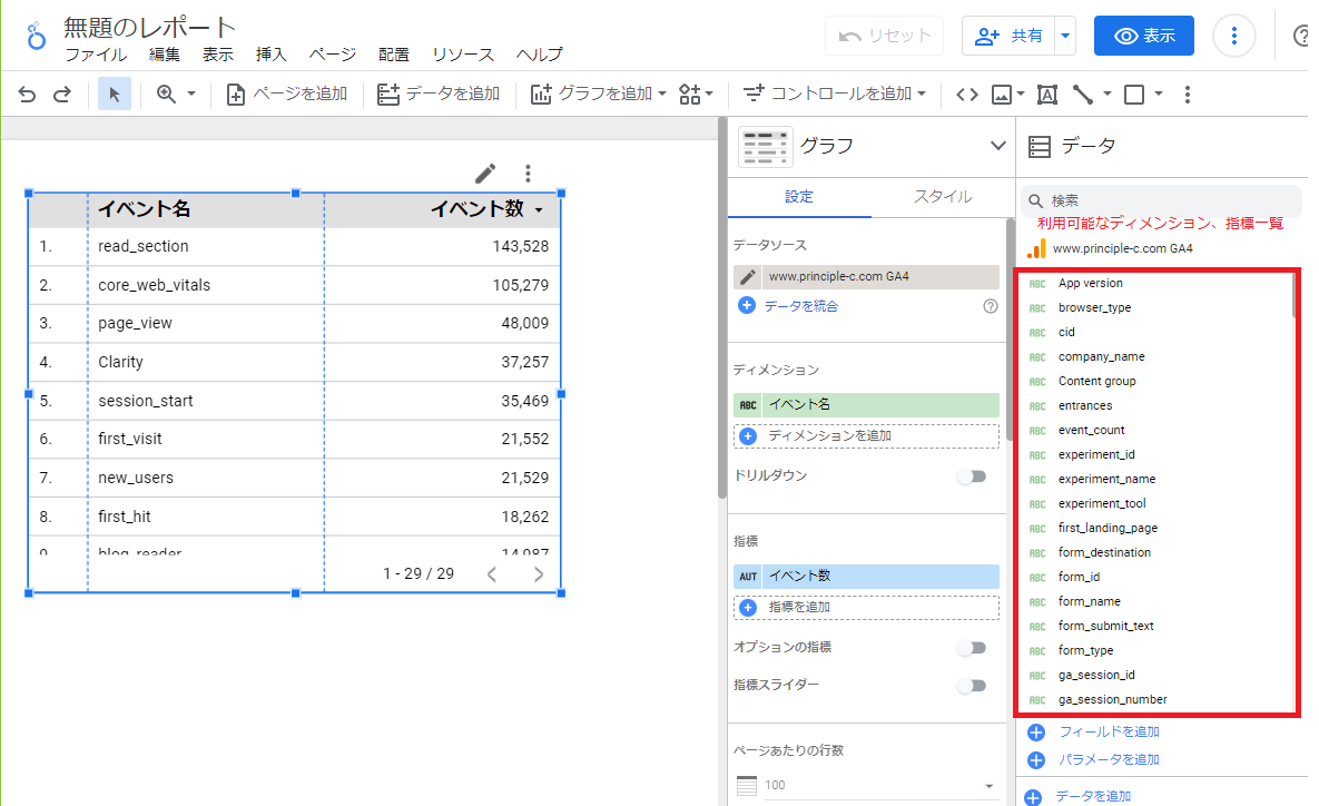 (2) 分析したいプロパティを選択すると、該当プロパティのデータがレポートに追加され、利用できるようになります。