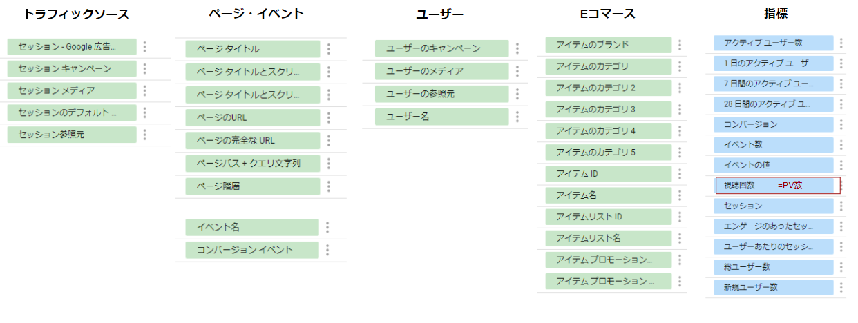 コネクタを利用する影響で、閲覧可能なディメンション・指標に制限があったり、項目名が異なる場合があったりします。