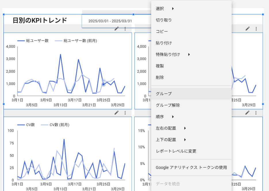 個別のグラフにのみ絞り込みを行いたい場合には、フィルターコントロールとグラフを「グループ化」することで対応します。
