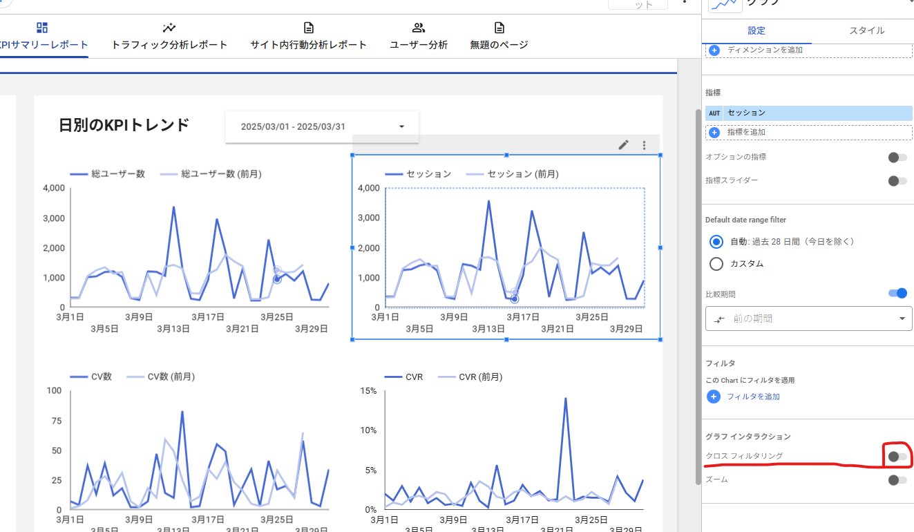 • フィルターとして使いたいグラフを選択 → プロパティパネルの「クロスフィルタリングを有効にする」をONにするだけで設定完了
