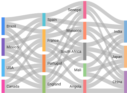 以下の画像は公式ヘルプに掲載されている作例です。国名が書かれたカラフルな縦棒を「ノード」、ノードをつなぐ線を「リンク」と呼びます。通常、リンクの太さは集計値が高いほど太く表現されます。