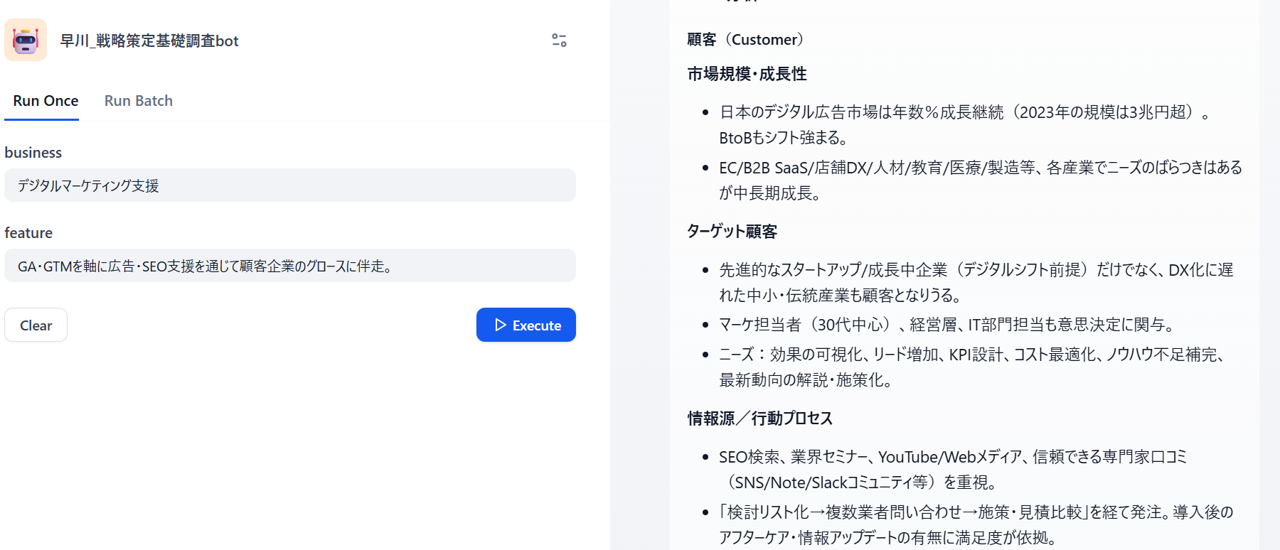 筆者が作成したアプリでは、調査対象の「事業」と「特徴」を入力するだけで、上記3ステップの調査アウトプットを一括で出力することができます。例として弊社のデジタルマーケティング支援事業の調査イメージを掲載します。