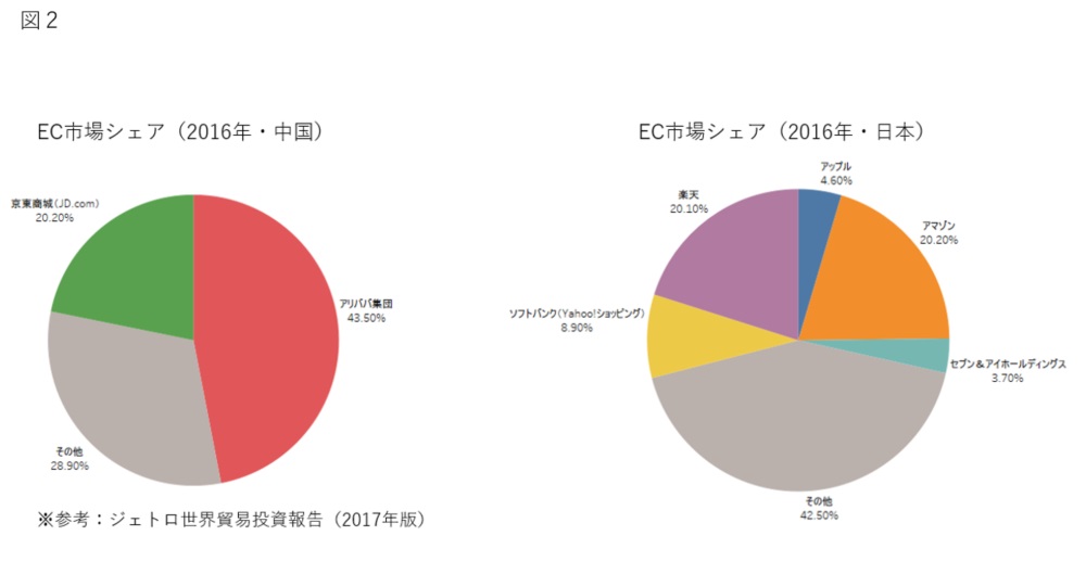 アリババがここまで独占している理由は、「アリババが中国の決済と物流の課題を乗り越えた」とジェトロが同レポートで見解を示しています。特にアリババ集団が開発した決済システム「アリペイ」(※注3)はクレジットカード化が遅れた中国にて、EC市場決済の主流になりました。中国EC市場発展の追い風に乗って、アリババは現在の地位につきました。