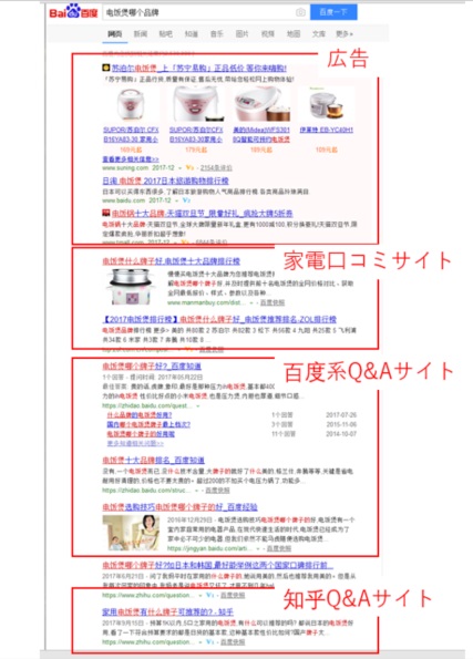 ・百度にて「質問系キーワード」を検索する際に、自然検索結果には関連口コミサイトやQ&A系のサイトが上位にランキングされてます。特に百度、知乎はどんな質問にでも出てくるサイトになります。