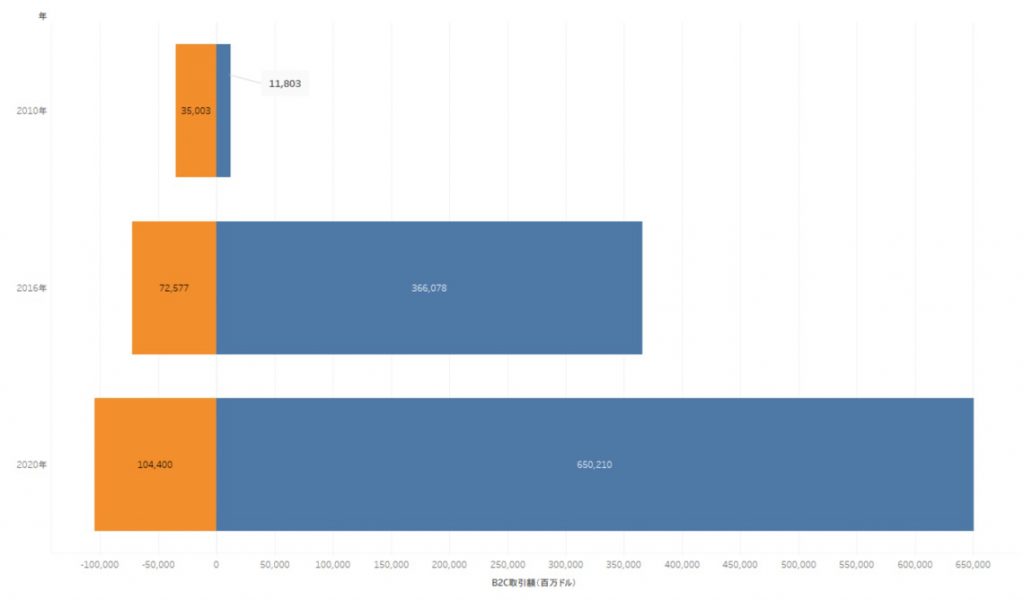 中国EC市場の発展は比較的遅れていましたが、2010~2016年に取引額が30倍ほどの伸長しました。2020年のB2C取引額は6500億ドルの見込みとなります。