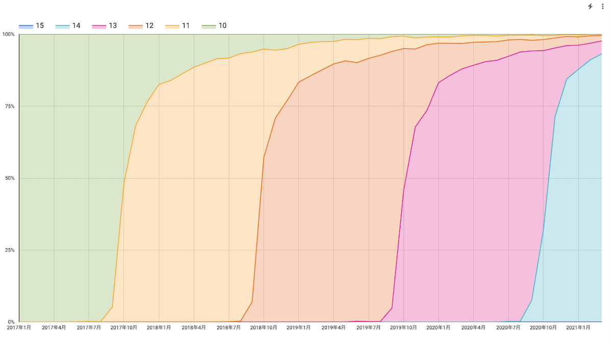 このグラフから、iOSのセッション中に最新バージョンが占める割合は、ほとんどのメジャーバージョンアップで、リリースから3ヶ月で75%を超え、12ヶ月で90%を超えるという傾向を読み取る事ができます。つまり、9割のiPhoneユーザーが1年後には最新バージョンに乗り換えている、と考えるのが妥当でしょう。