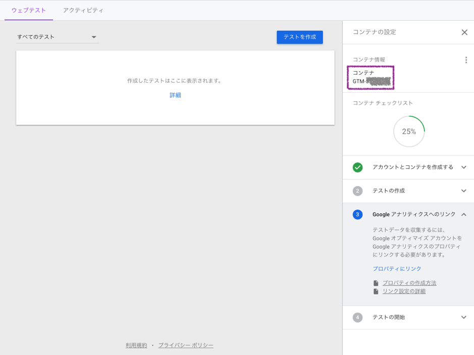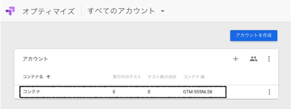 キャプチャ画像紫枠に表示されている「コンテナID」は後から確認することもできますが、後ほどGoogle Tag ManagerでOptimizeスニペットを設置する際に使用するので、メモ帳などにコピー&ペーストしておきましょう。