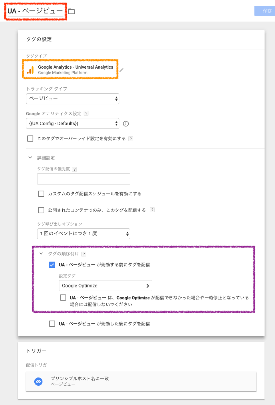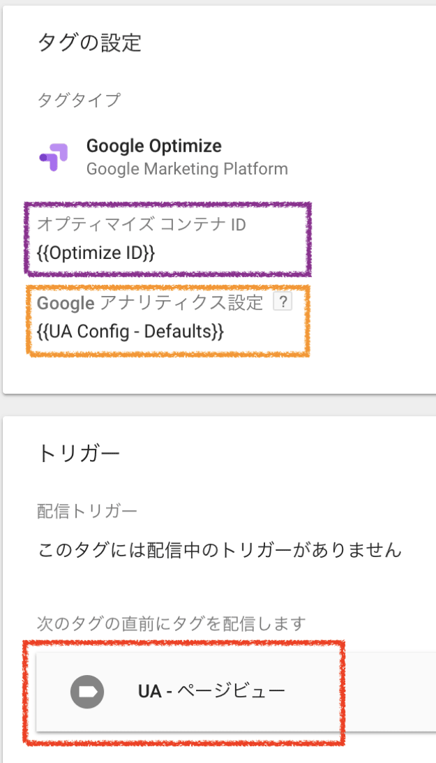 Google Tag Manager経由でGoogleアナリティクスのページビューやイベントタグを設定している場合、画像オレンジ枠の「Googleアナリティクス設定」は、Google Optimize用に設定したものとGoogleアナリティクスのページビュータグなどでも同一のものを利用する必要があります。