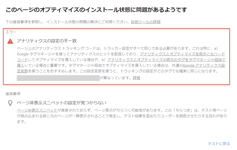 ここで問題が発生している場合は「(2) OptimizeコンテナをGoogle Tag Manager経由で設置する」に立ち返り、Googleアナリティクスタグとの設定内容乖離などが発生していないか、確認します。