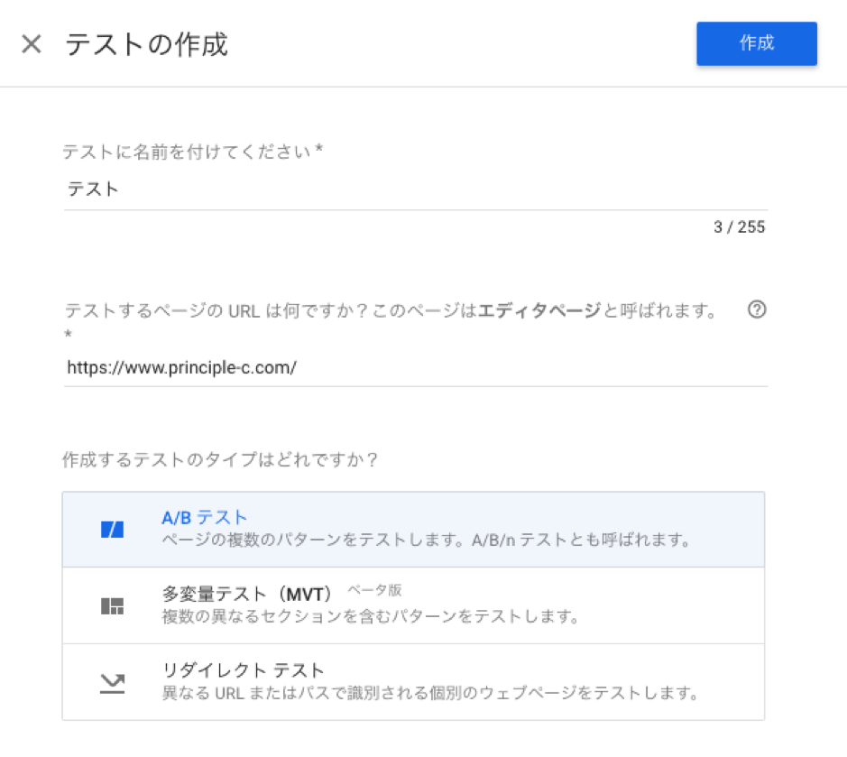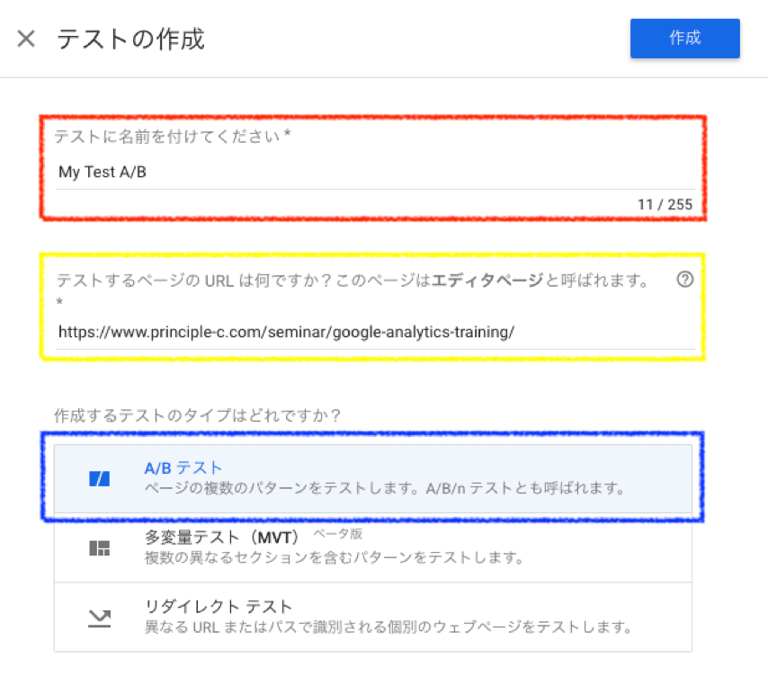画像赤枠部分にテスト名を記入し、A/Bテストを実施したいページのURLを入力(画像黄枠)し、「A/Bテスト」を選択(画像青枠)したら、右上の「作成」ボタンをクックします。