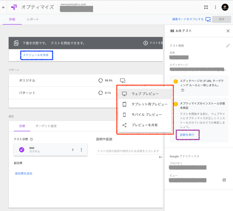 またこの時点でOptimizeタグの実装に問題がないか、「診断を実行」(画像紫枠)することで確認もできるので、テストするページで確認しておきましょう。