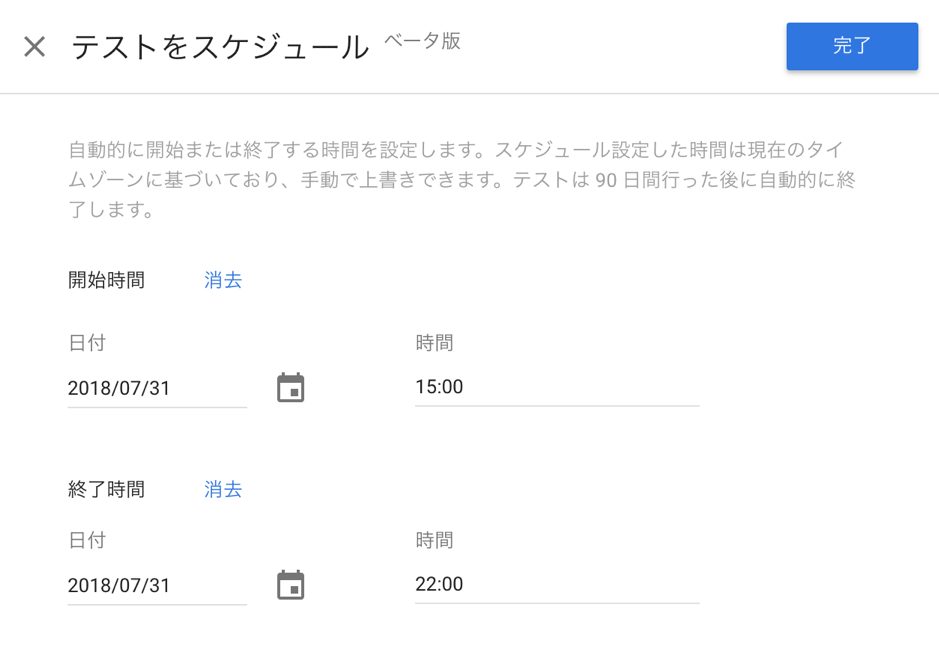 なお、β版機能として「テストをスケジュール」という機能も提供されています(画面青枠)。テスト対象数が十分であることが事前に予測できている場合、こちらを利用してスケジュールを組んでおくことも可能です。