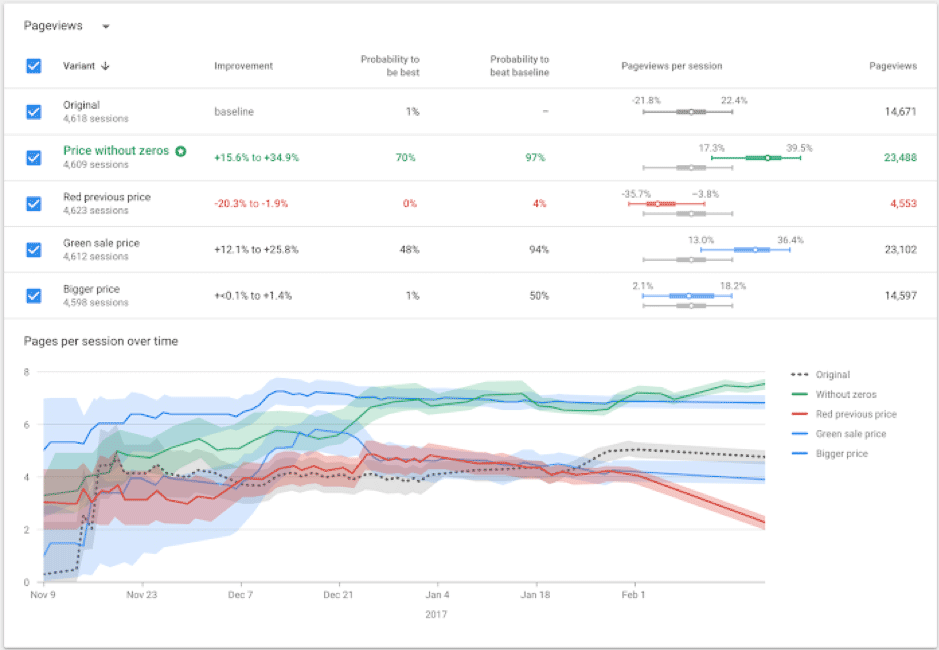 テスト内容を簡単に読み取ると、11月9日〜2月末の4ヶ月近くに渡るテストの結果、オリジナル(黒い破線)に対して4つの対抗パターンを立てたところ、緑の破線であらわされた「Price without zeros」パターンのページ/セッションの指標が、11月23日を過ぎたあたりからオリジナルのパフォーマンスを上回りはじめ、各破線の周りにあるハイライト(予測値の幅)も明らかに緑のパターンがオリジナルを上回ることが分かります。