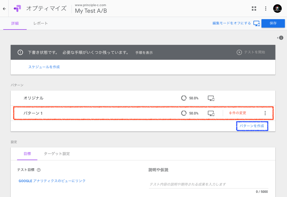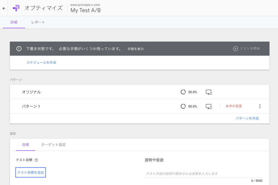 パターンの編集が完了したら詳細ページに戻り、テスト目標の設定を行います。
