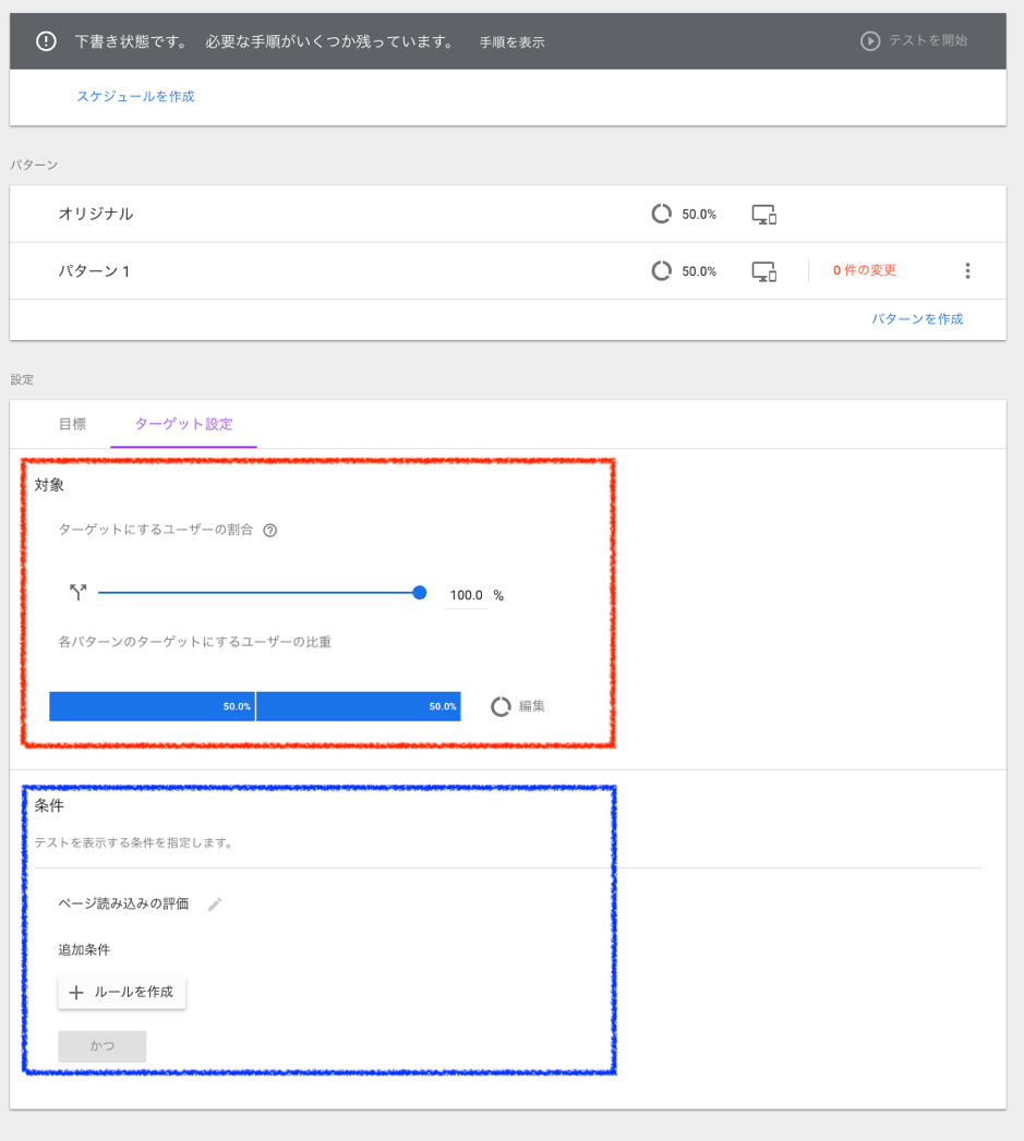 「対象」のセクションは、Googleアナリティクスのウェブテストでいうとそれぞれ、