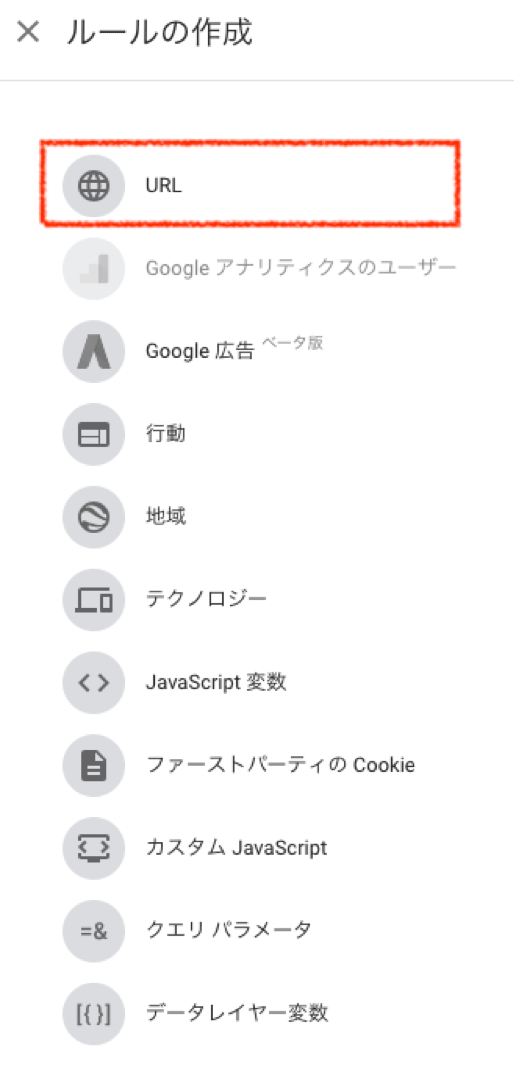 必要最小限のルールとして「+ ルールを作成」から「URL」で、テスト対象ページのURLを設定します。