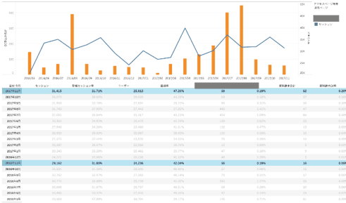 日々のアクセス量の推移と、サイトの離脱率などの「量」と「率」が1枚のスライドで把握できる。