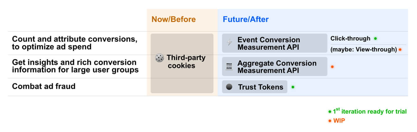 これらの項目について、「専用のAPIが公開される」「cookieではなくブラウザベースで計測やターゲティングを管理する」というのが今回のPrivacy Sandboxの主旨です。