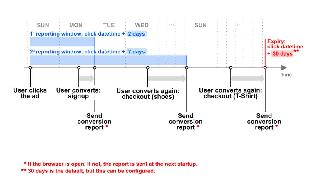 • 複数クリックからのコンバージョンは、ブラウザ側でアトリビューションモデルを踏まえたCVレポートを送信する