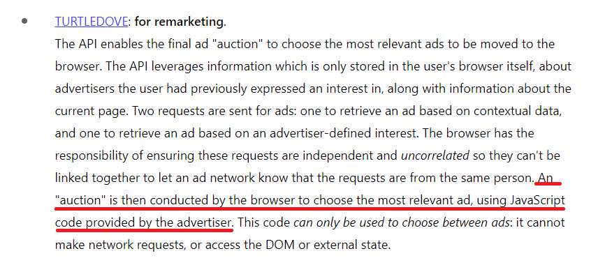Tutledoveでは、従来のようにアドサーバー側でオークションされ広告コンテンツが読み込まれ表示されるのではなく、”ブラウザがオークションを実施” し、広告主から提供されたJavaScriptコードを使用して最も関連性の高い広告が表示されるという仕様が検討されています。