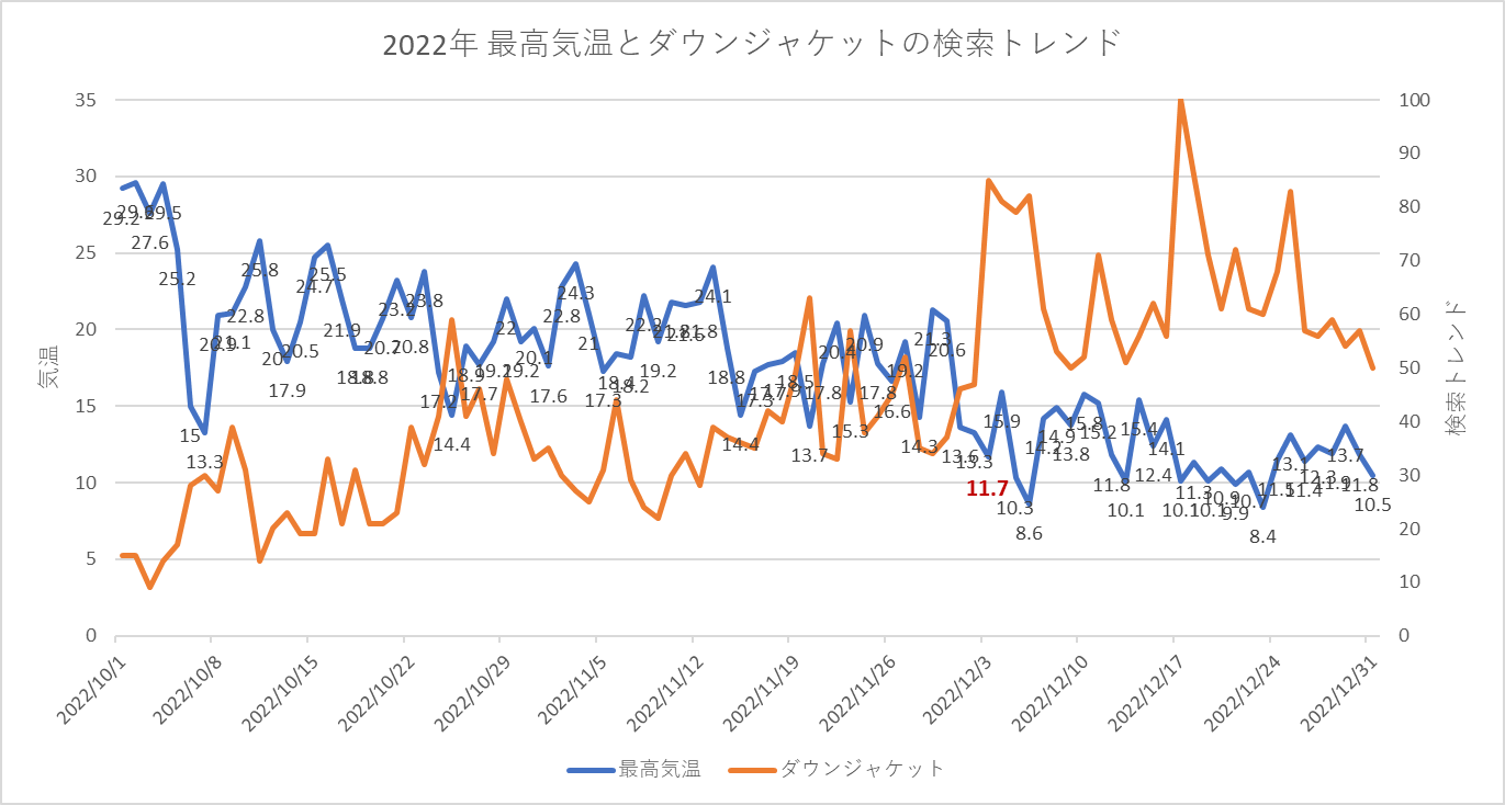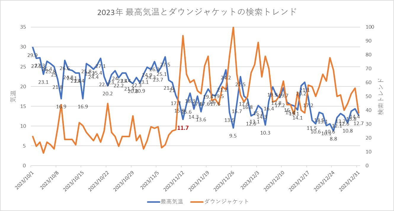 2023年のデータからは11月上旬に11.7℃まで気温が下がり、そのタイミングで検索トレンドが90以上まで急激に上昇しています。検索トレンドの最高値100になったのは、気温が9.5℃まで下がったタイミングとなっています。気温が急に低下したタイミングで検索トレンドが急上昇しているのが見て取れます。