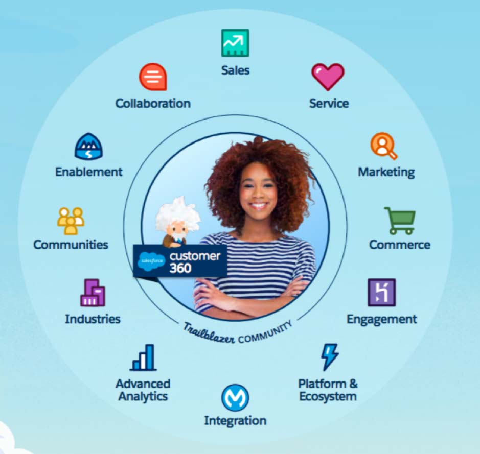 Customer360とは「セールス、サービス、マーケティング、コマースから分析まで、Salesforceはプロダクトの拡充とTrailblazersたちのコミュニティの力によって、カスタマーサクセスをあらゆる角度からサポートできるようになったことから、 Salesforceのプロダクトをより深く連携させ、まさに360度すべての角度から一歩先のカスタマーサクセスを提供するための新たなプラットフォーム」ということだそうです。