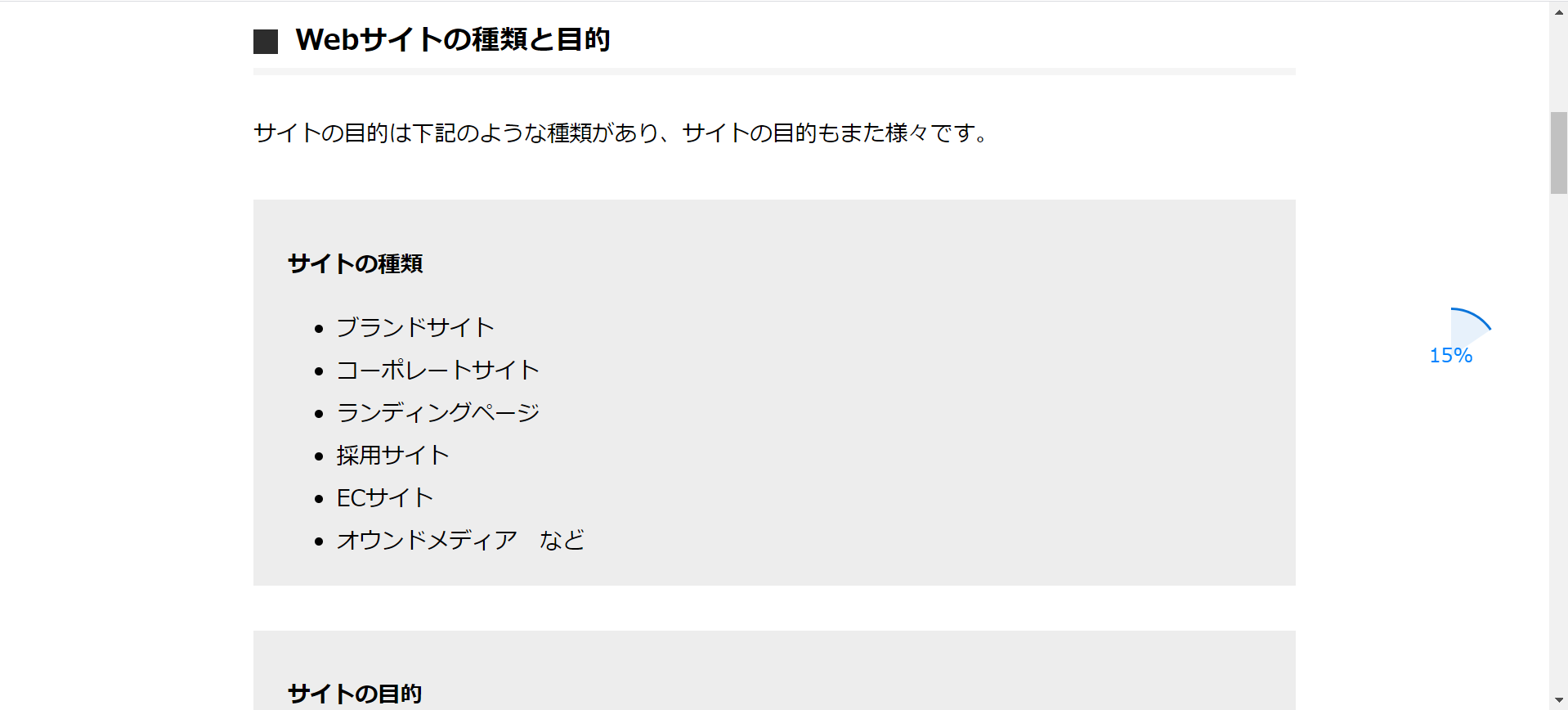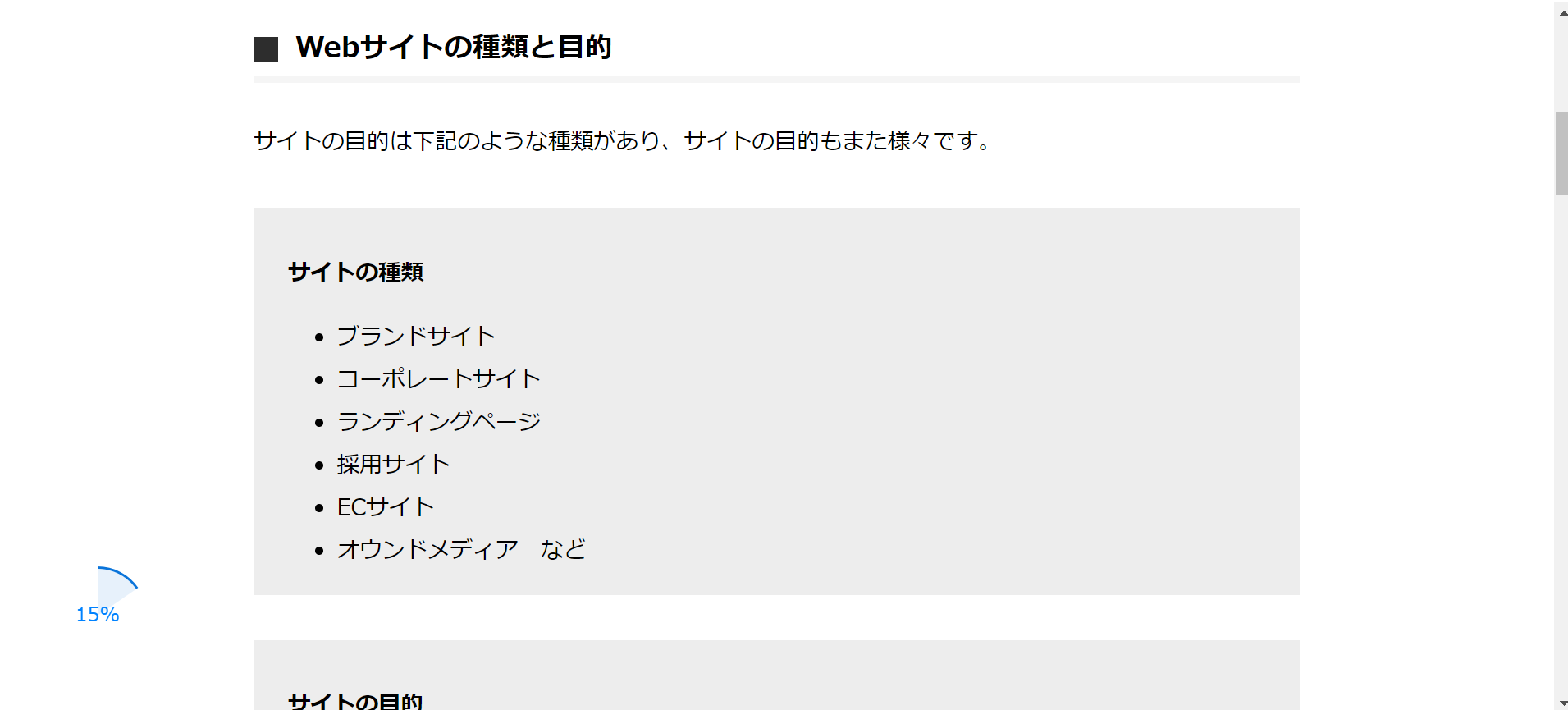 円状のプログレスインジケーター(コンテンツを読んでいくに連れて、時計回りに色で塗りつぶされていき、0%から100%にパーセンテージが増加していく)をウェブページの右側に設置する。