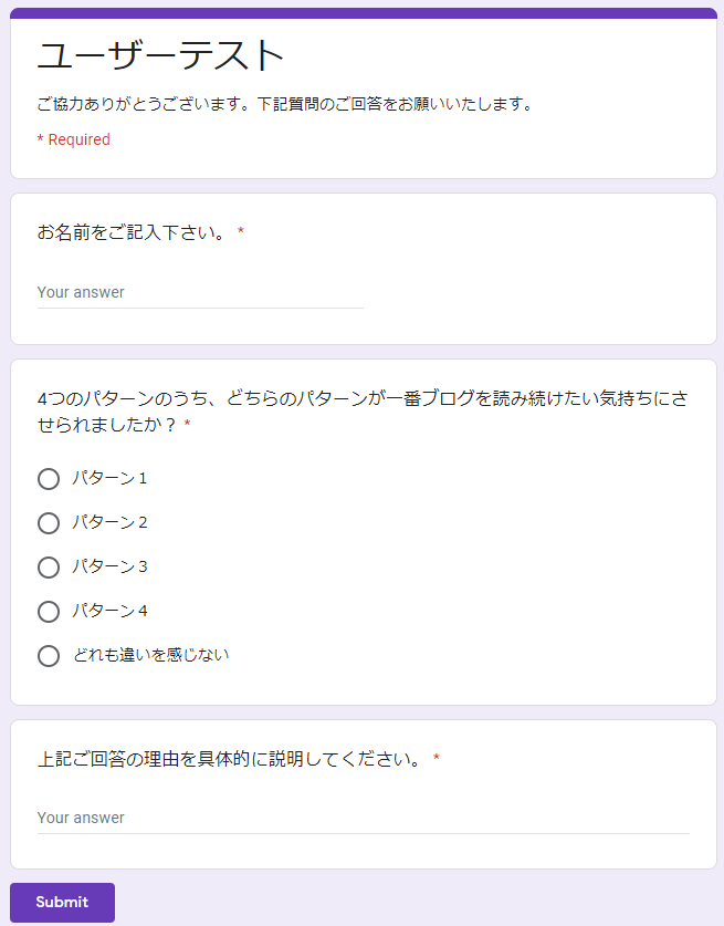 - 質問1:4つのパターンのうち、どのパターンが一番ブログを読み続けたい気持ちにさせられましたか?