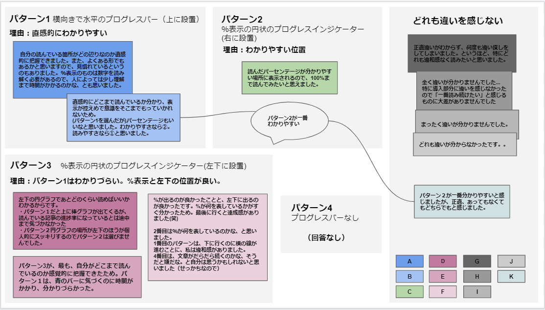 右に設置してあるため、一番視界に入りやすいプログレスインジケーターがあるパターン2がわかりやすいという意見が複数ありました。しかし、パターン3がより多く効果的なプログレスバーとして選択されたのは、視界を邪魔せず、コンテンツから注意を逸らさない位置にあるからと思われます。