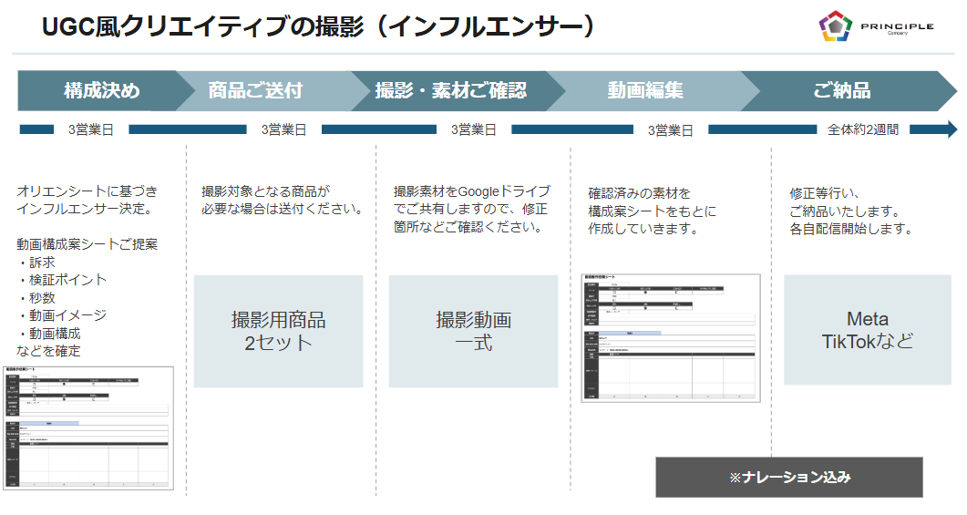 株式会社プリンシプルでは、ウェブ集客の戦略策定から実行まで一貫して支援しています。UGC広告に関しても、ペルソナ作成、広告コピー作成、インフルエンサー選定、素材撮影、編集、広告配信、クリエイティブ分析まで幅広くサービス提供が可能です。