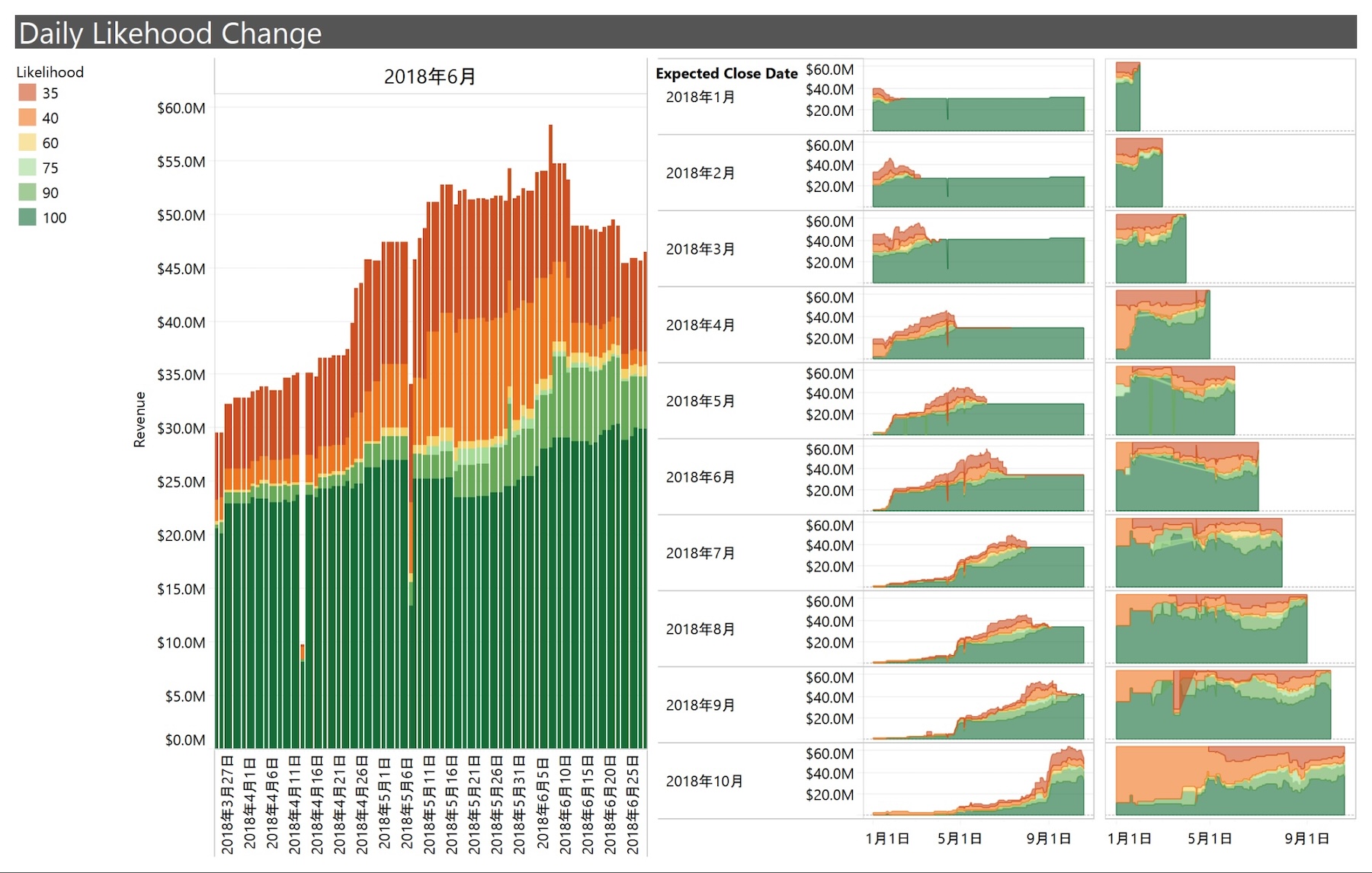 経営層向けのダッシュボードで、主にKPI(重要業績評価指標)や目標達成状況を日次で追跡するのに利用されます。企業全体のパフォーマンスを俯瞰でき、迅速な経営判断をサポートします。