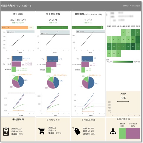 現場の担当者向けのダッシュボードで、日々の業務を効率化するために設計されています。日次のデータを表示し、例えば、実店舗の稼働状況、商品の在庫状況、購買データなどを即座に確認できます。