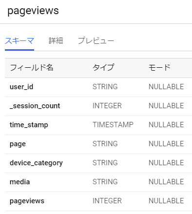 BigQueryにアップロードし、テーブルを作成すると、スキーマは以下の通りになります。pageviewsテーブルという名前にしました。