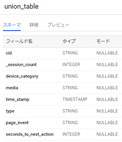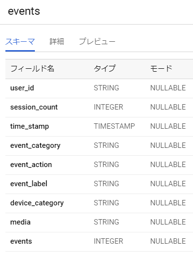 BigQueryにアップロードし、テーブルを作成すると、スキーマは以下の通りになります。eventsという名前にしました。