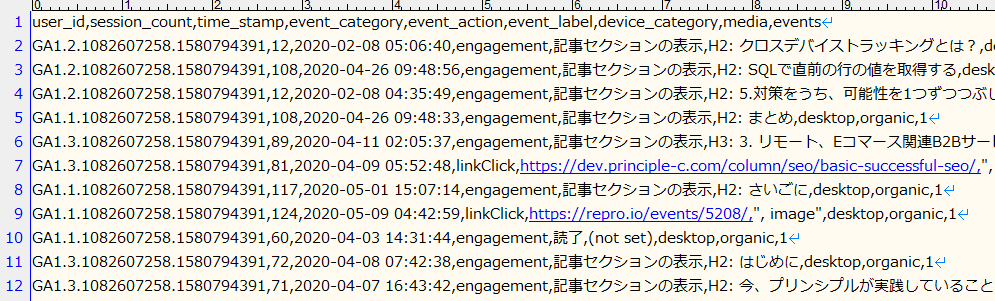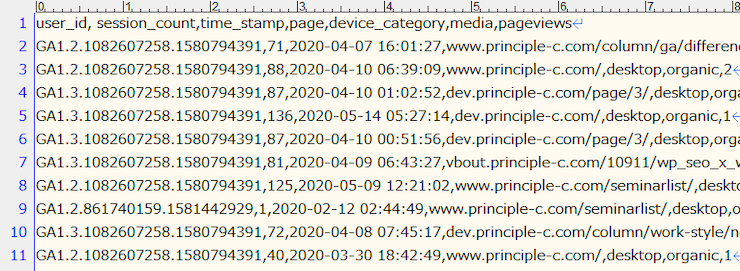 - レコードがページビューだったのか、イベントだったのかを明示するために、固定のテキスト”PV”、もしくは”EV”を6列目に記録しています。(10行目と19行目)